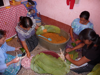 I came back for lunch at my host family's to find Patty, live-in cook, maid/cousin, hauling a huge sack of potatos into the kitchen. Why? My host mom, Estella, said she would make 500 potato tamales for the local school for a snack. Let me tell you, this tamale-making is definitely an endeavor.