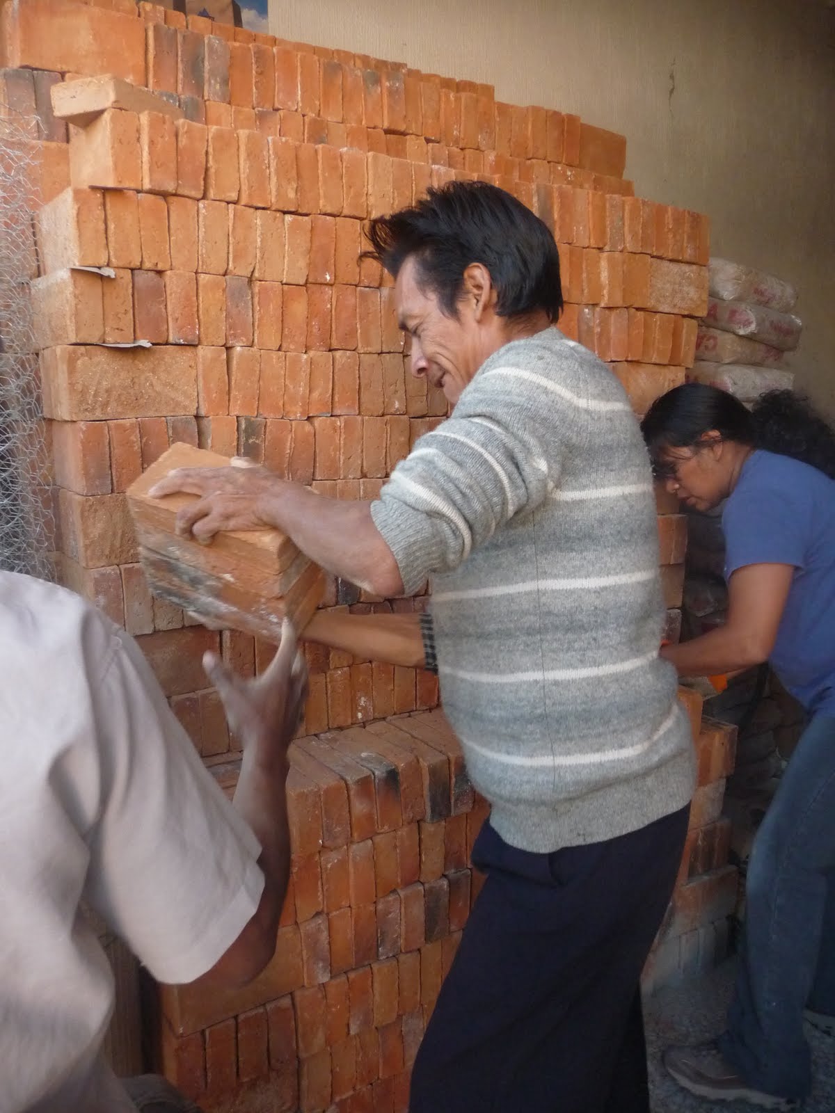 The women helping to cement the bricks together